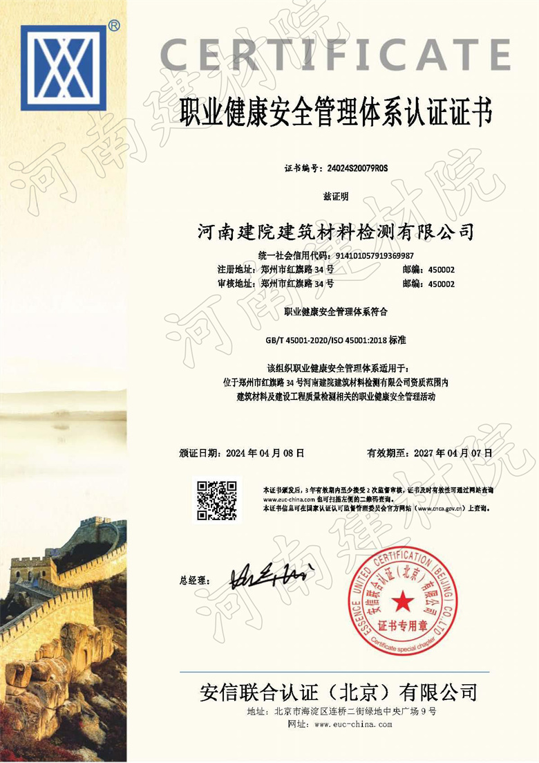 职业健康安全管理体系认证证书